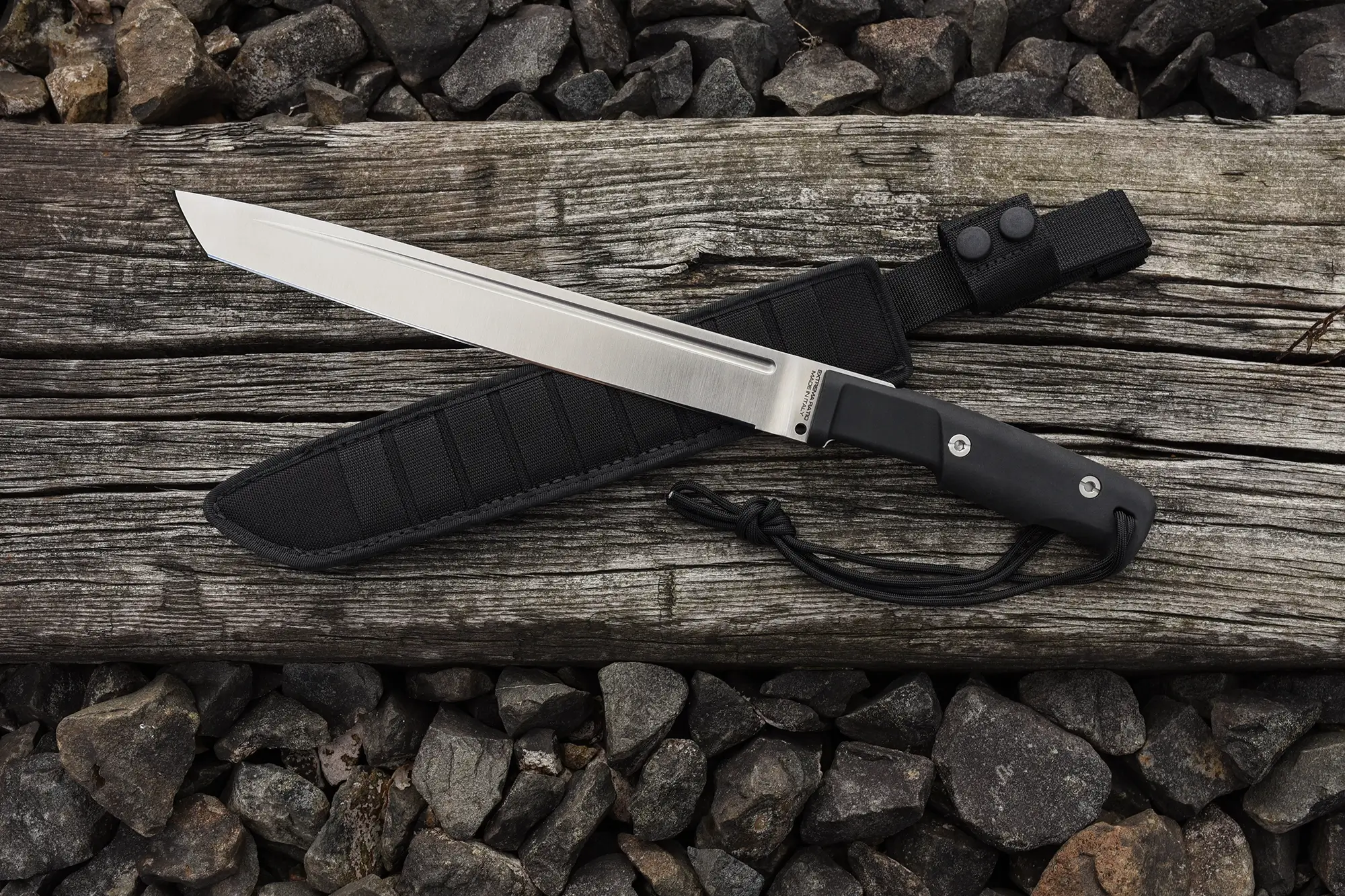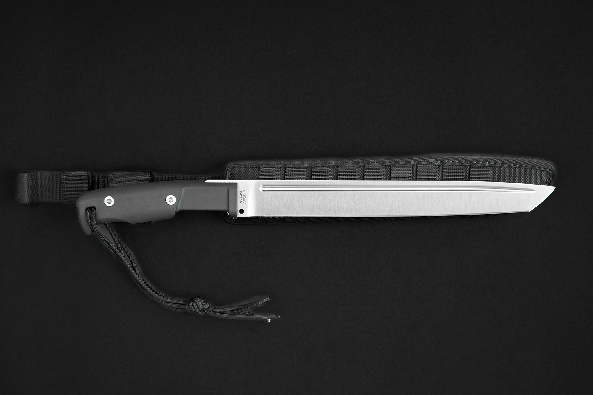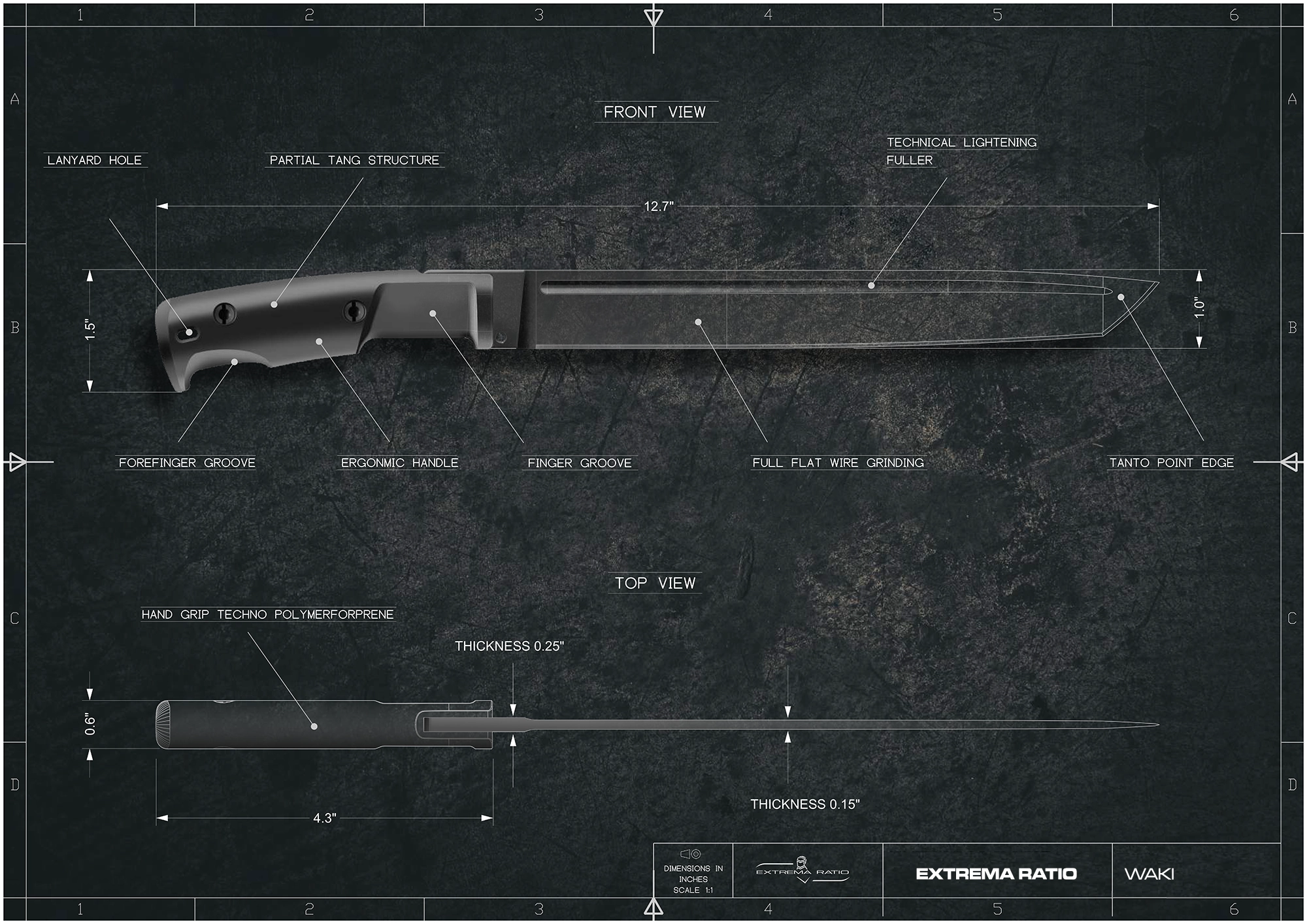 This is a reinterpretation of the Japanese Wakizashi sword, a traditional blade 30 to 60 cm long, which the Samurai used to carry by their side together with their Katana. The blade features the classic Japanese Tanto profile and is made of Böhler N690 steel with heat treatments that bring its hardness to 58 HRC for best combining edge retention and resistance.
