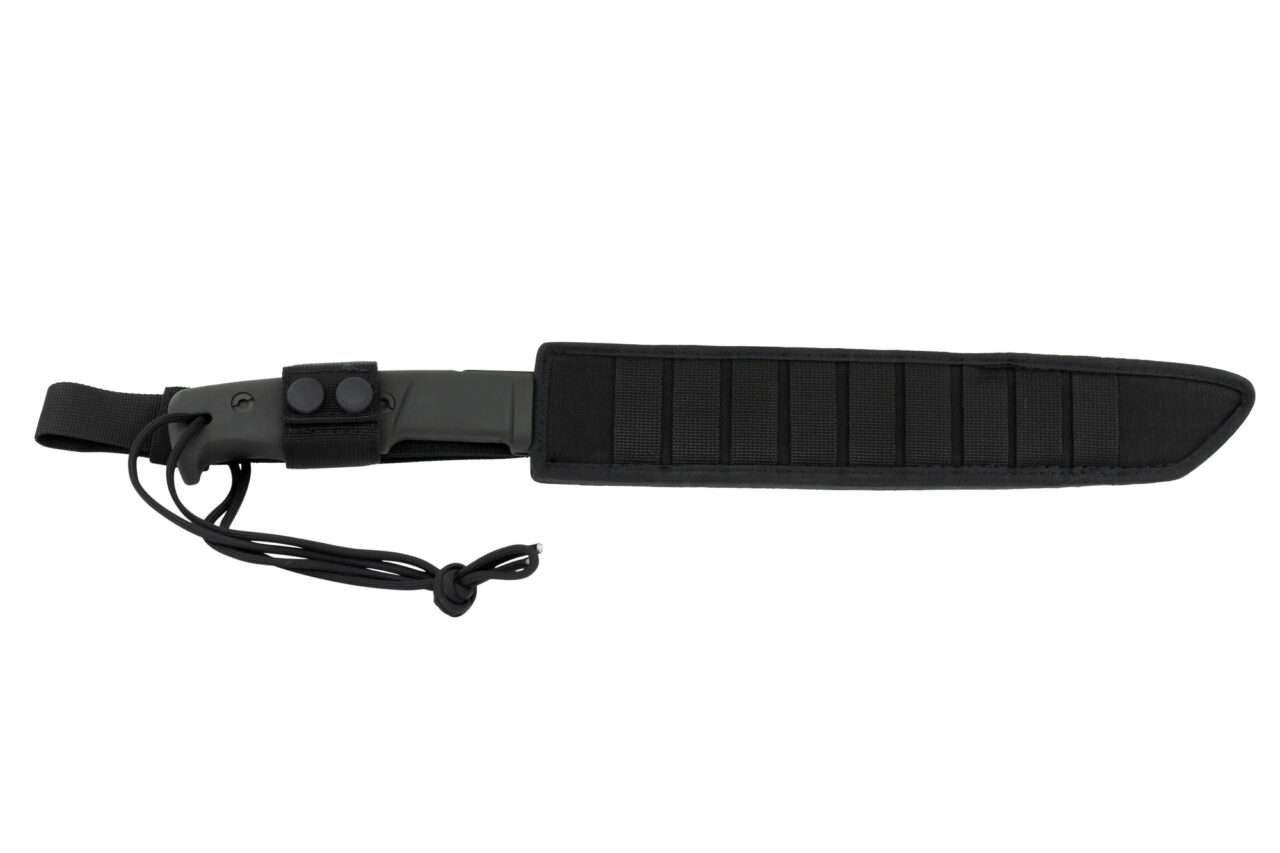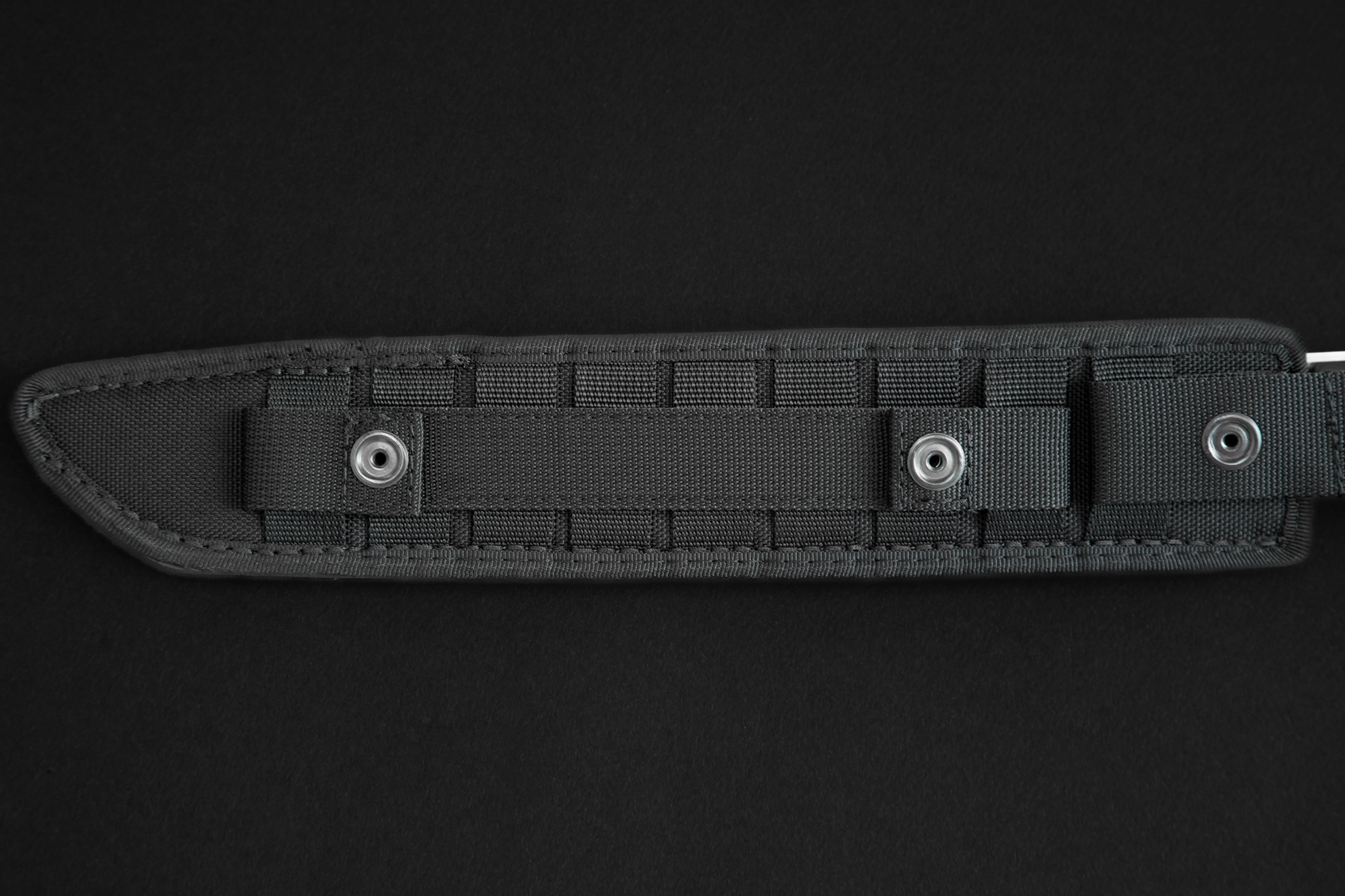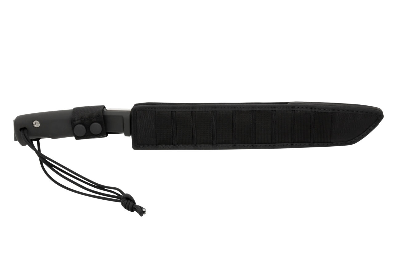 The black handle is made of Forprene. The black Cordura sheath is equipped with M.O.L.L.E. system webbings, which guarantee safety during carry and protects the knife from shocks that could reduce its efficiency.